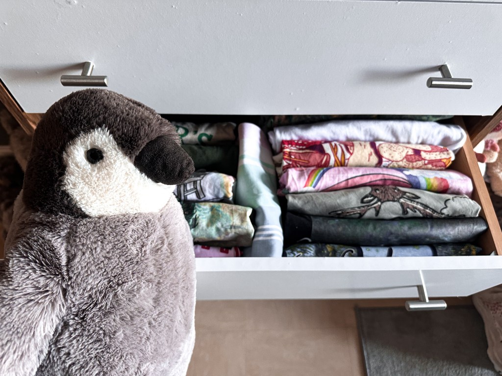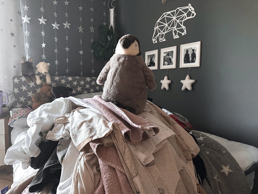 I put a load of washing into the machine, which for some reason, made no dent in the endless mountain. Then I had to put the dried washing from yesterday away so there would be space to put up the next load on my curtain poles. I grabbed it all, and put it all on my bed. My Jellycat penguin Pesto climbed clean laundry Everest, and gave me emotional support. I smiled because he looked so cute on the mountain, he’s so fluffy and comforting.