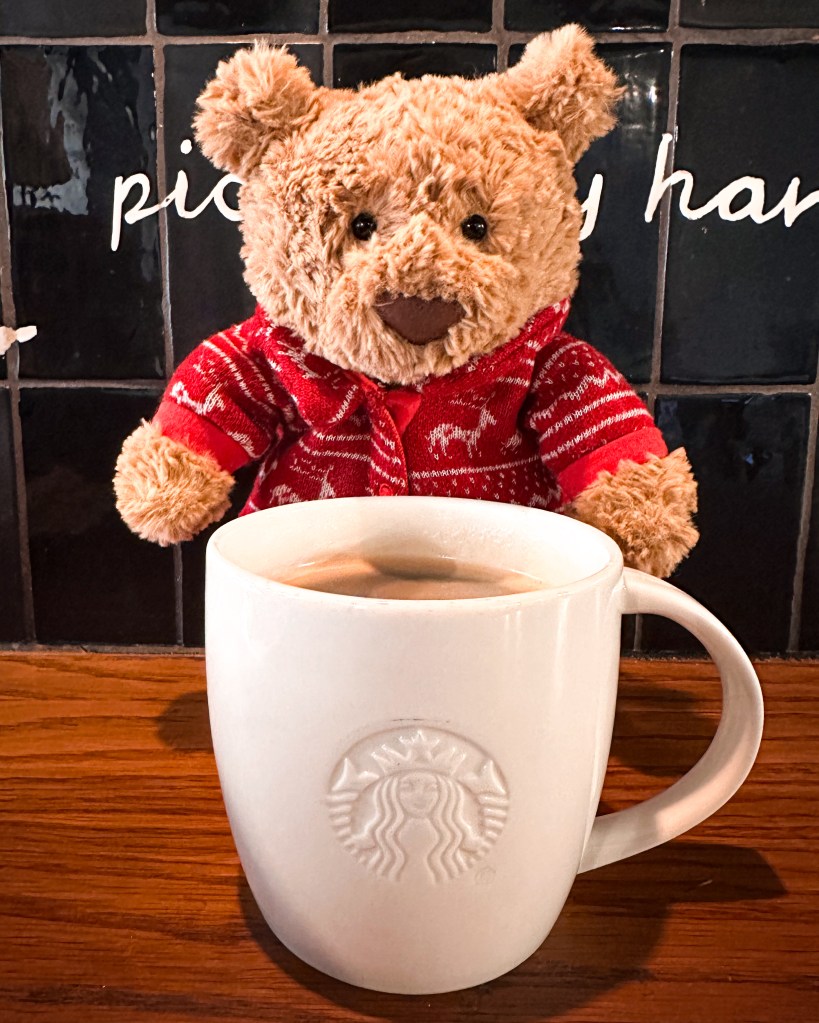 We sat down with our drinks, plushies at the table with us, and I tried to drown out Clippy by taking a bunch of cute pictures of my bear with my coffee. It was the only distraction I could find. I felt exhausted, numb, and so tired of my own brain. When we finished our coffees we headed to get some food for later.