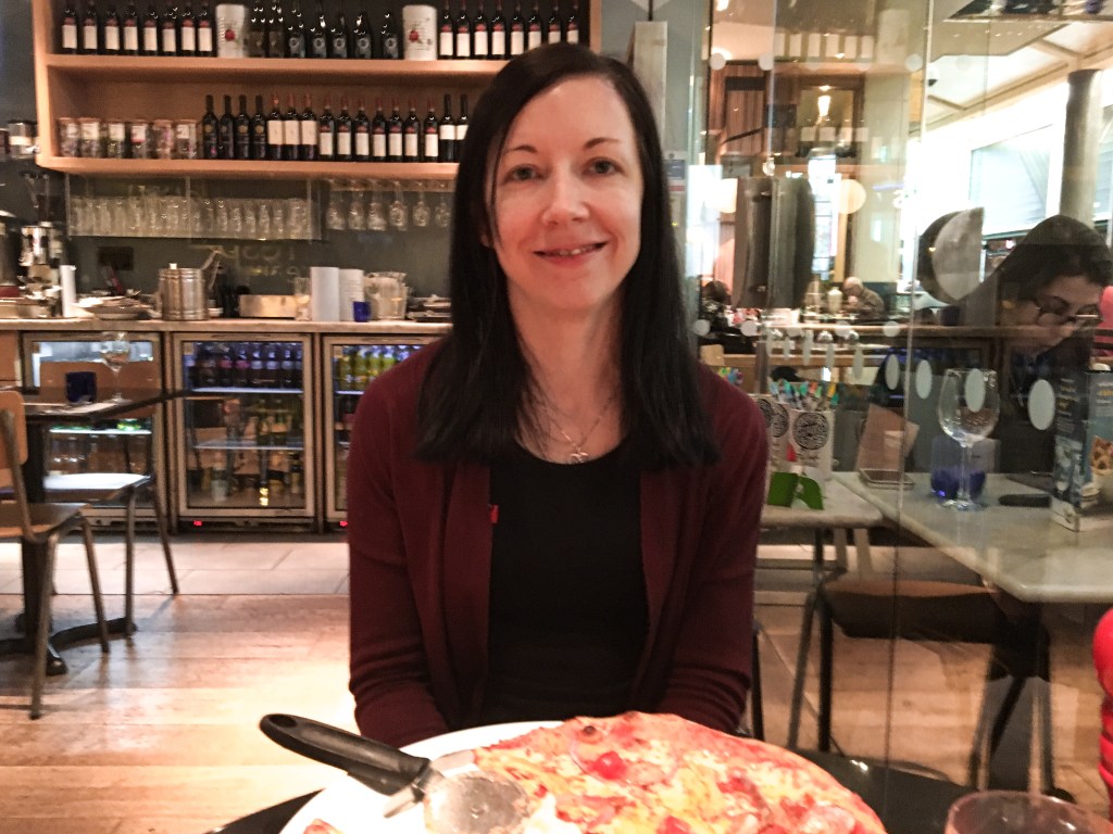 A different year, this IS me, weight restored, eating a whole pizza in Pizza Express to celebrate my sons birthday