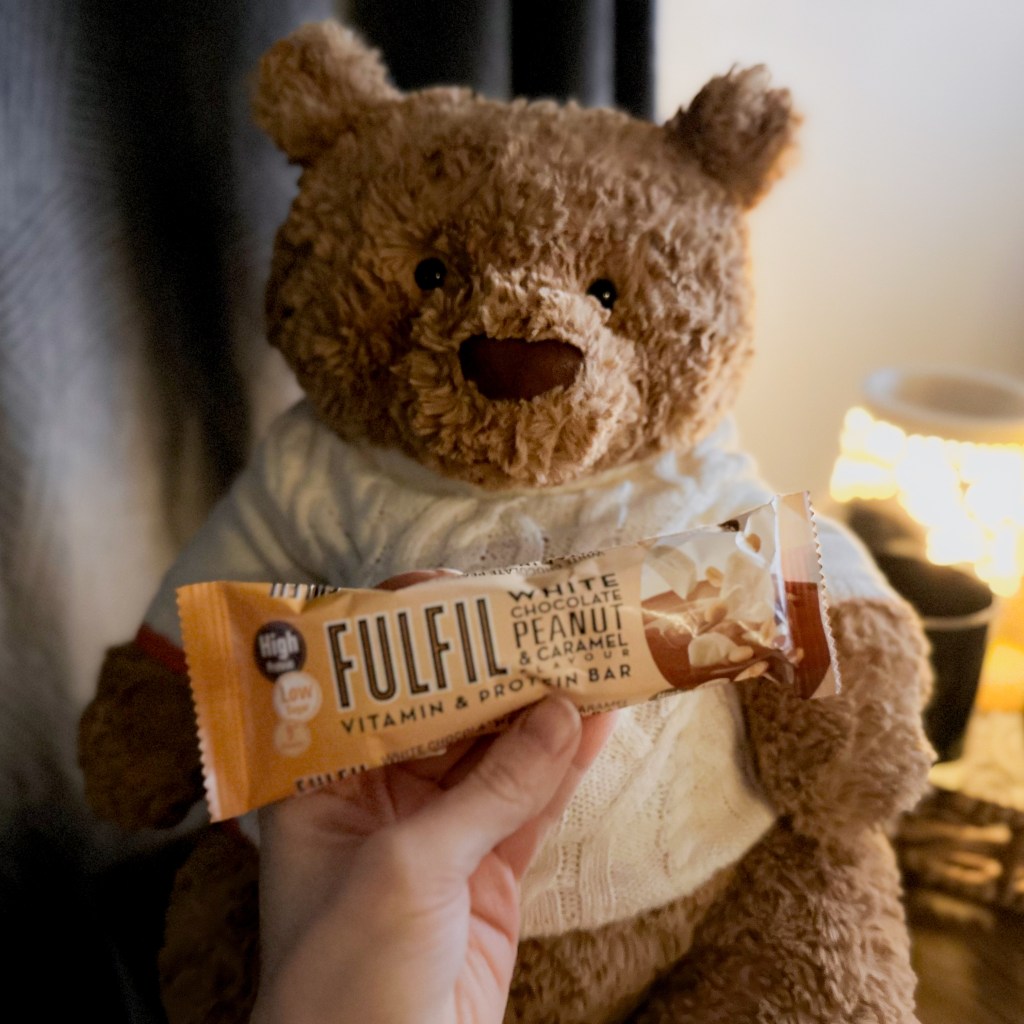I am obsessed with my Fulfil protein bars so despite the difficulty, I enjoyed eating a whole one. I actually prefer them to chocolate bars — they’re not as sickly, and they’re so satiating, and they’re reactive hypoglycaemia approved. Regular chocolate bars make me really ill in terms of my blood sugar. My favourite Fulfil bar is the white chocolate peanut caramel. It’s just so good.