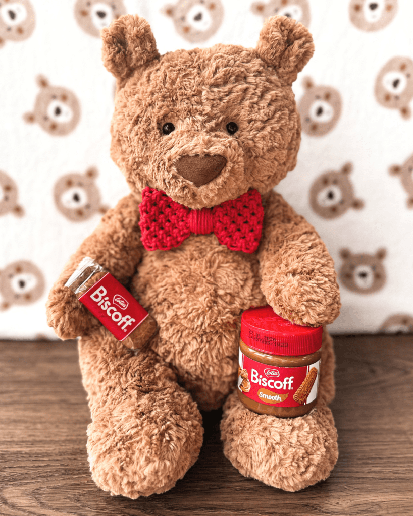 Next I tried to make a red and white bow, like a Biscoff label, but didn’t really like it on him very much. And then I had the most adorable idea ever: a cream sparkly one, to match my favourite oversized hoodie. The red one is still my favourite, but I do love the cream one too. I think you’ll agree — Sir Biscoff is looking dapper and adorable all at once.