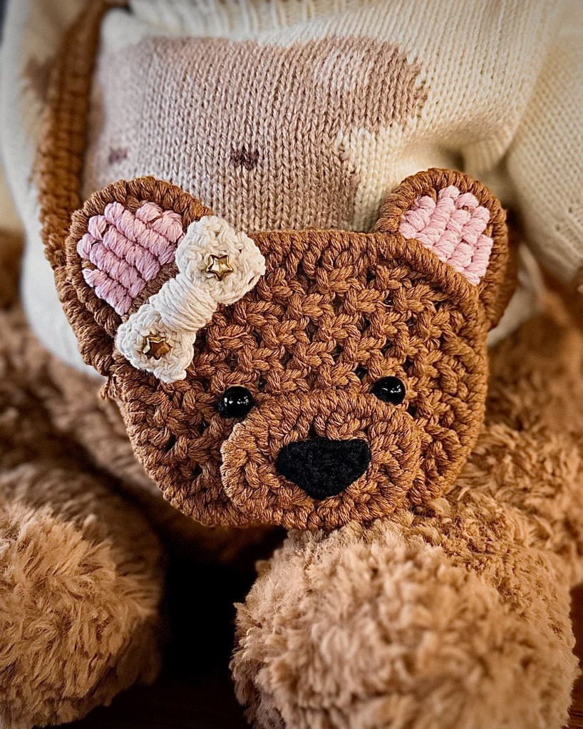 The macrame bear bag I made for Charlie