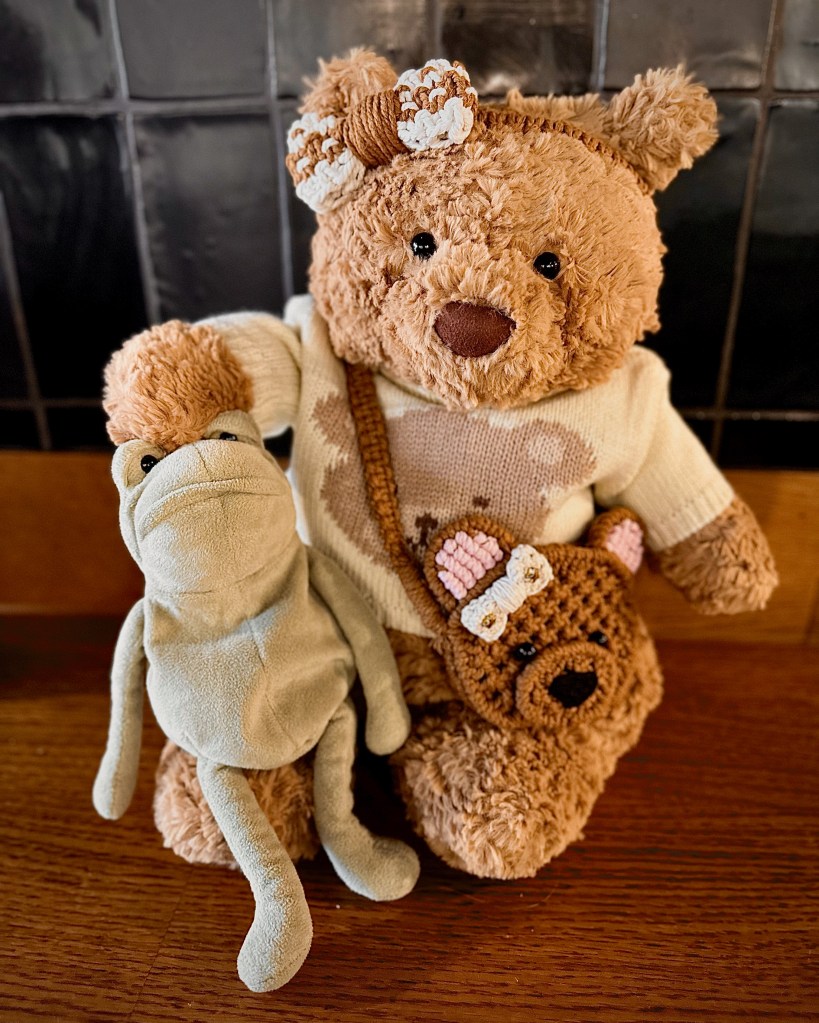 After our adventure, we went to Starbucks to decompress from the horror that is public behaviour during Christian holidays (seriously why are people the most inconsiderate during holidays?). He got a lime refresher, I got my always-same Americano, and we shared our drinks with our plushies. I brought Charlie, who wore a tiny bear jumper and a bear macramé bag I made for him (complete with matching bow, obviously). My son brought Ferg the frog.