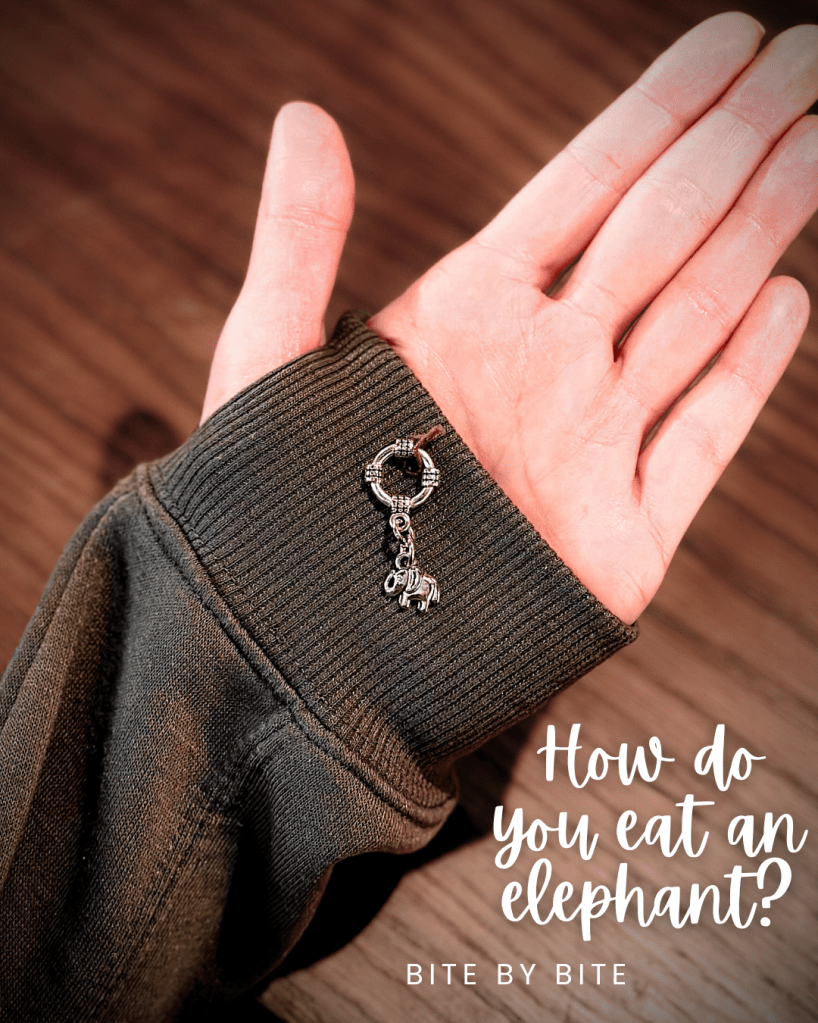And now, a little silver charm elephant lies on the pavement with me, shining out to me the same way she did. Guiding me the same way she did – the little elephant reminding me how recovery is bite by bite.