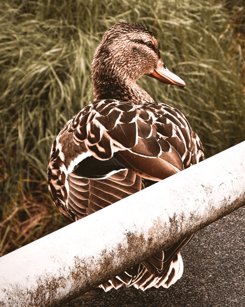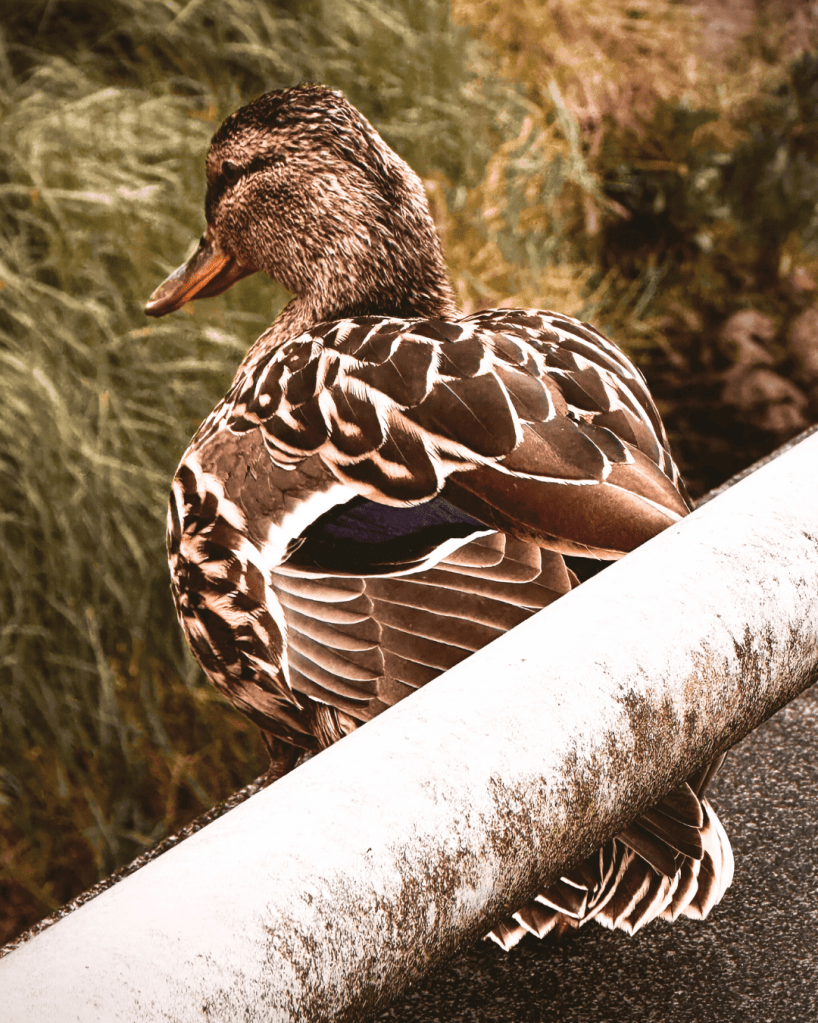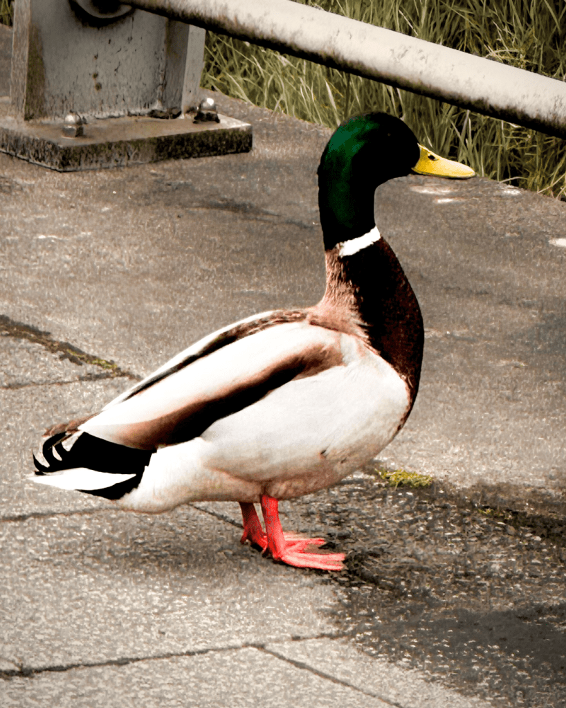 Continuing to walk to town, and with me being completely bombarded with feelings of WeeGee – still with the little elephant charm in my hand, as if WeeGee and I were holding hands quantum entangled through the distance of time – I saw another light directly in our path. The glimmer of duck feathers, while a little duck preened himself in the middle of the pavement and then I saw his duck fren behind a little fence.