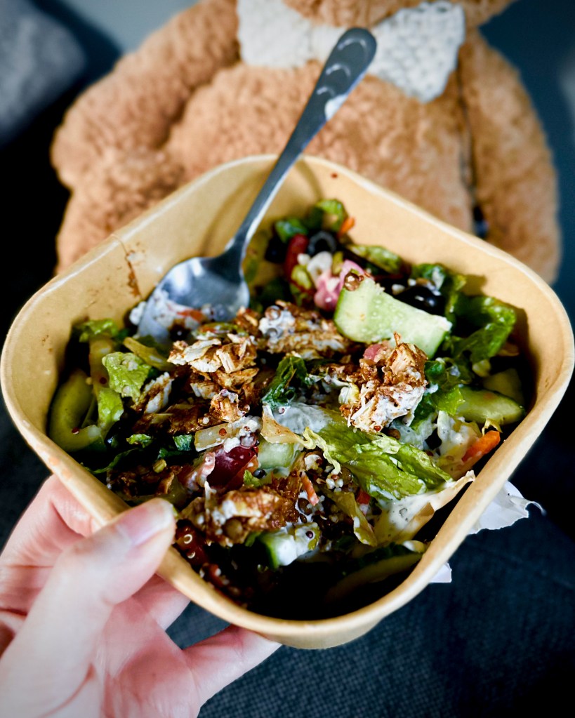 The chicken shawarma salad, complete with olives, was absolutely delicious. I used all of the dressing, but honestly, I would have totally used even more. The yoghurt and mint dressing was almost a religious experience.