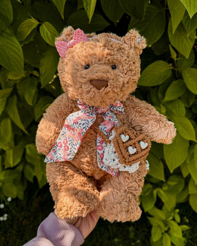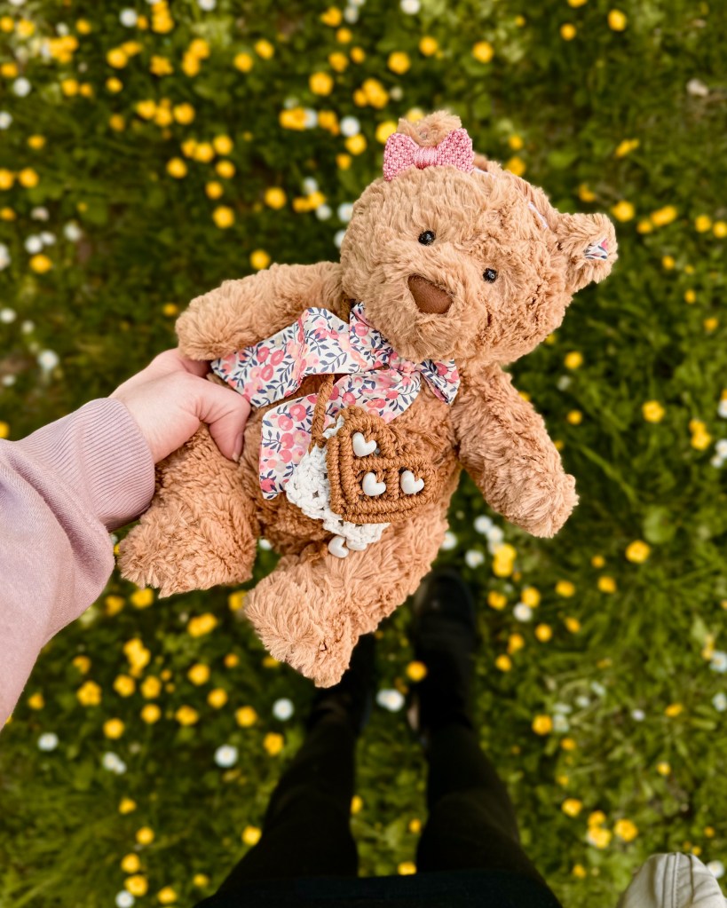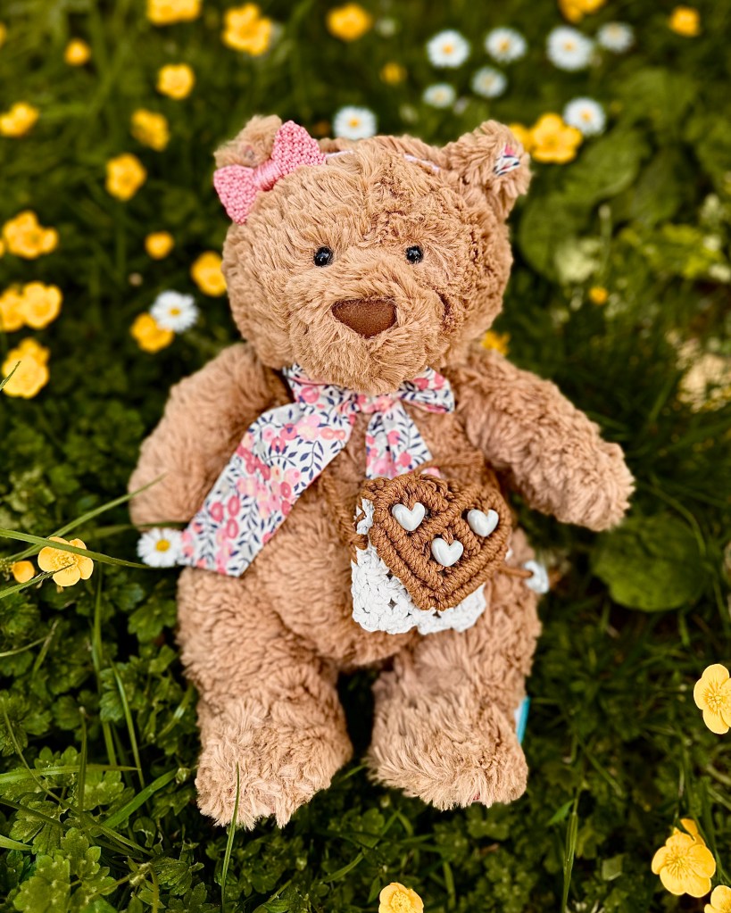 I took Enfys, my new Liberty Jellycat Bear. I hadn’t taken her outside yet, and I was really excited to give her a little adventure (you can read all about her arrival in this post). My son took Cutie Patootie, (who you can also see in this post, as I babysit him quite a lot when my son’s at university). I dressed Enfys in a new brown and cream macramé bag, complete with heart beads and a pink mini macramé bow I’d made especially for her. My son dressed Cutie Patootie in rainbows.