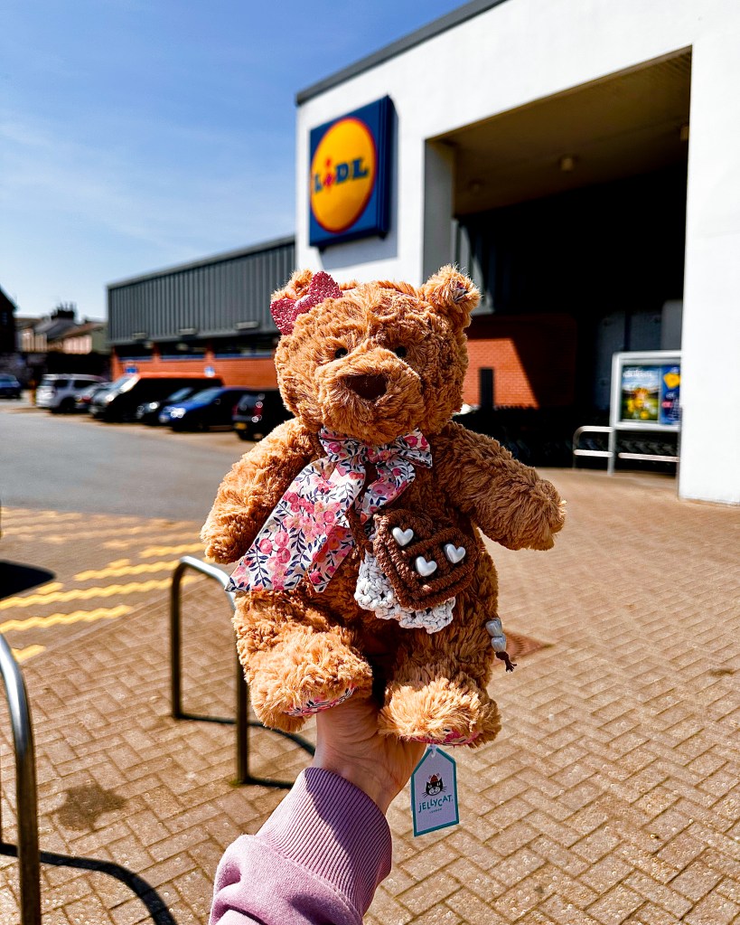After we waited for the post person to deliver another of my son’s packages — he had a student finance payment recently and is feeling flush — and my coffee FINALLY cooled down enough to drink, we got ready to go outside. Which of course also included getting our bears ready, as we’d impulsively decided to go on a little bear walk on the way to Lidl.
