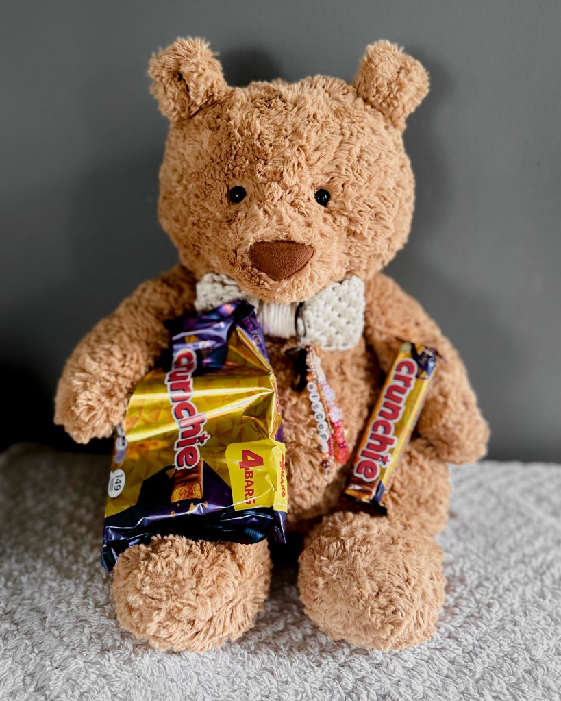 We stocked up on emergency essentials to last until I could order some food or go and get some more. Bread, butter, potatoes, my salad stuff, some treats for my son and – yes – Crunchie bars. I told my son why I got them: “Ever since the nurse said your foot was crunchy, I haven’t been able to stop thinking about Crunchies.”