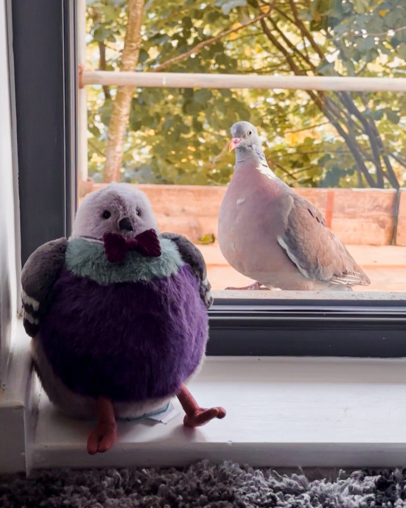 I just love that photo with the plush pigeon and the pigeon outside your window. What a great capture.