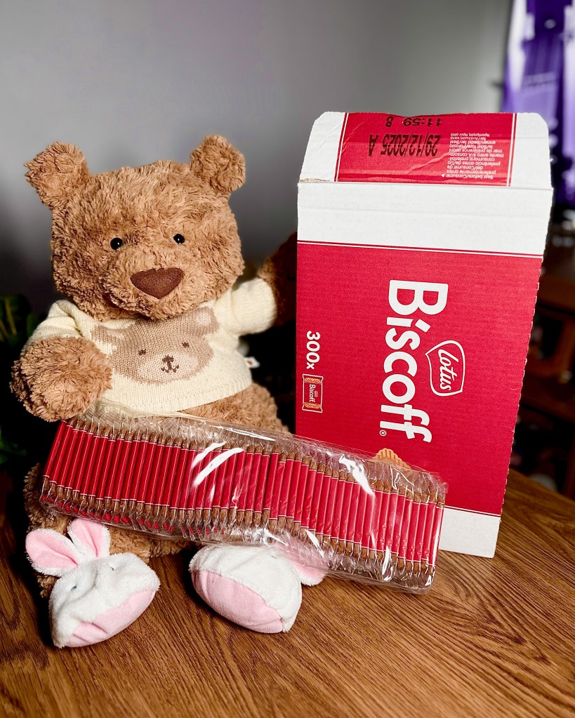 And so, 24 hours later, thanks to the miracle of Prime next-day delivery, there it was – on my living room floor (because my kitchen is far too small to house 300 biscuits): a beautiful red catering box of Biscoffs. Biscoff the bear was so happy. If Jellycats had real emotions, he would have felt like he’d won the lottery. But with 300 biscuits sitting there, it made me think too deeply about the significance of buying them during recovery from a mini lapse.
