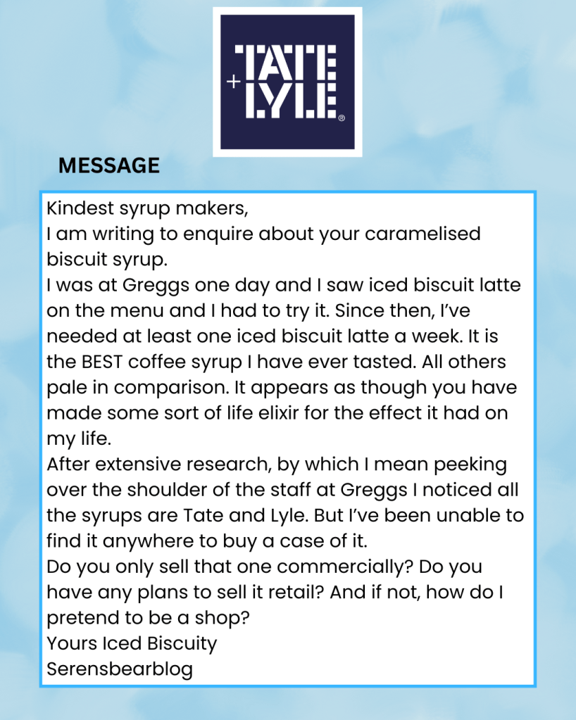 Which got me thinking: maybe I should just email Tate & Lyle, the makers of the caramelised biscuit syrup, and ask if they plan to sell it retail. So I did. I told them they had created a life elixir and, if they weren’t planning on selling it retail, how I could pretend to be a shop to buy it commercially. I’m still waiting on a reply.