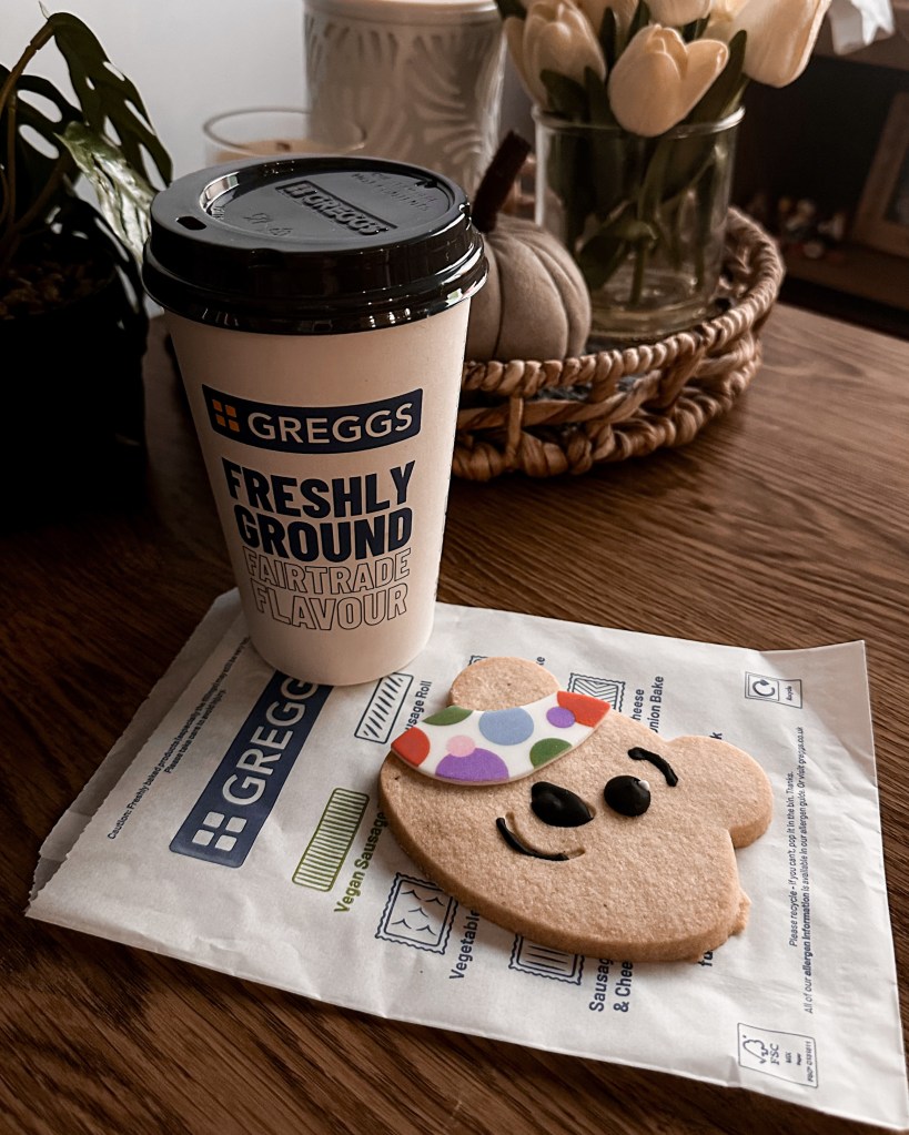 I wanted to go back on what I set out to do – get a sausage roll, no matter how I felt. As we stepped inside, my son said he wanted to treat us since he wasn’t paying for uni food this week. He joked, “Greggs is better when it’s free.” I saw the Pudsey Bear biscuits – adorable, of course – and decided to challenge myself with one. I haven’t had a “dessert” food from Greggs yet. My son got one too, and I ordered my usual Americano.