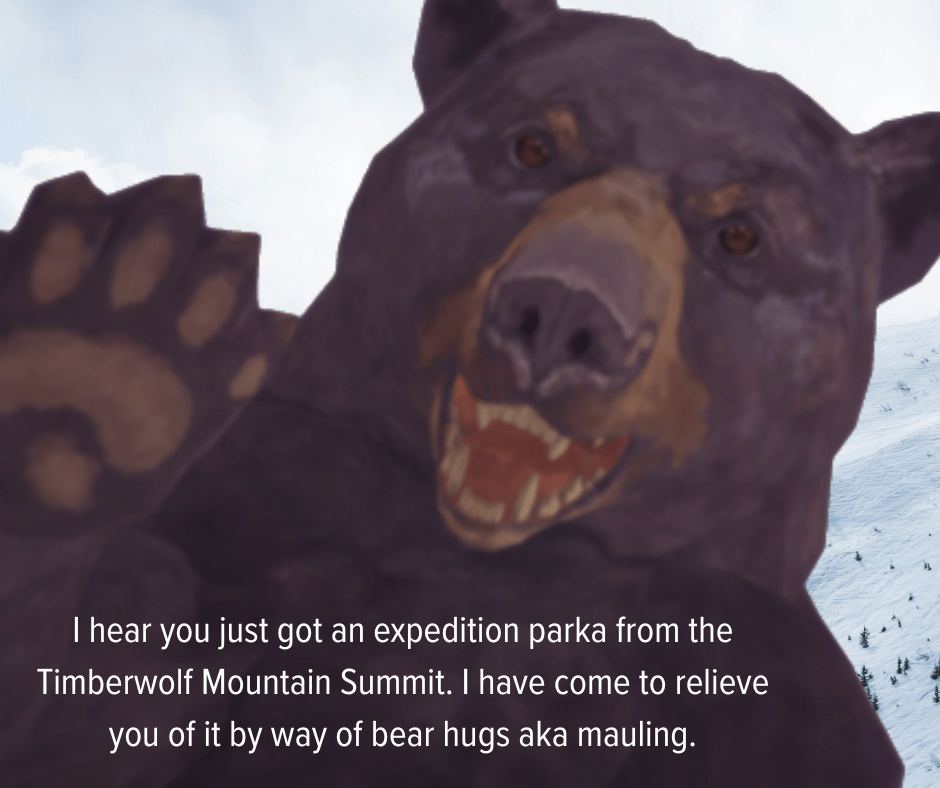 Then I started billy-goating down the mountain instead of using the ropes, encumbered, overconfident and technically cheating. Only one sprain and I used correct pathing even through heavy fog. Near the end, just above Crystal Lake, I heard it – the roar. A bear. Too close to escape. Too close to think. I lit a flare anyway. It only seemed to amuse him. He charged. Mauled. And in the process, completely destroyed my expedition parka.