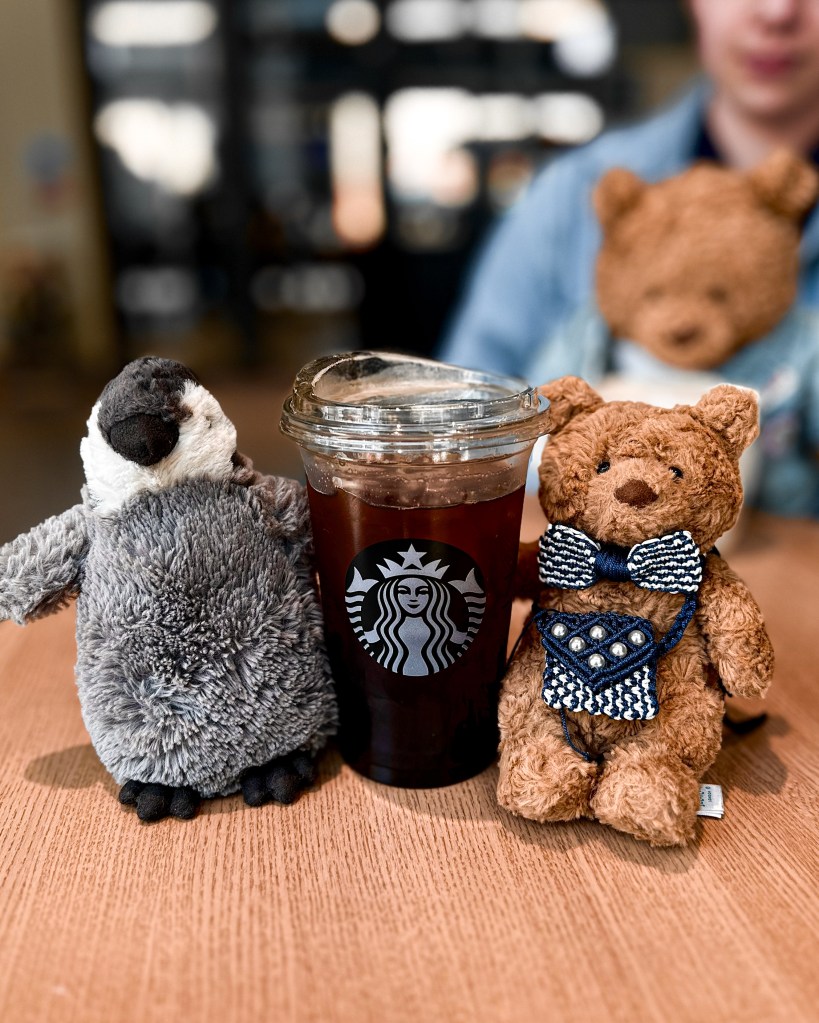 I got an Iced Americano, which was genuinely great, and we sat there with our plushies like always. The people next to us asked about them and were really lovely about it. My son had matched his bear to Ryland Grace – full outfit, tiny plush Earth and everything. It was adorable. That whole moment helped more than I expected.